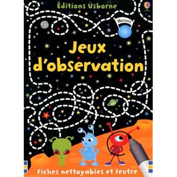 Jeux d'observation Ces fiches-jeux mettront à l'épreuve tes qualités d'observation et de déduction. Écris les réponses sur les fiches nettoyables avec le feutre fourni. ° Soixante-quinze jeux très divers : cherche la différence, vrai ou faux, séquences mélangées, images à associer, choses à chercher. ° Idéal pour tester son sens de l'observation et le développer. ° Avec un feutre effaçable pour écrire la réponse sur les fiches plastifiées.