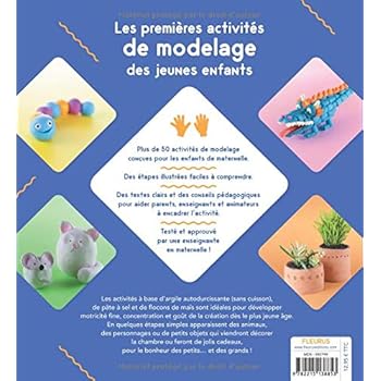 Les premières activités de modelage des jeunes enfants! - Plus de 50 activités de modelage conçues pour les enfants de maternelle. - Des étapes illustrées faciles à comprendre. - Des textes clairs et des conseils pédagogiques pour aider parents, enseignants et animateurs à encadrer l'activité. - Testé et approuvé par une enseignante en maternelle! Les activités à base d'argile autodurcissante (sans cuisson), de pâte à sel et de flocons de maïs sont idéales pour développer motricité fine, concentration et goût de la création dès le plus jeune âge. En quelques étapes simples apparaissent des animaux, des personnages ou de petits objets qui viendront décorer la chambre ou feront de jolis cadeaux, pour le bonheur des petits… et des grands!